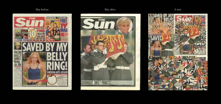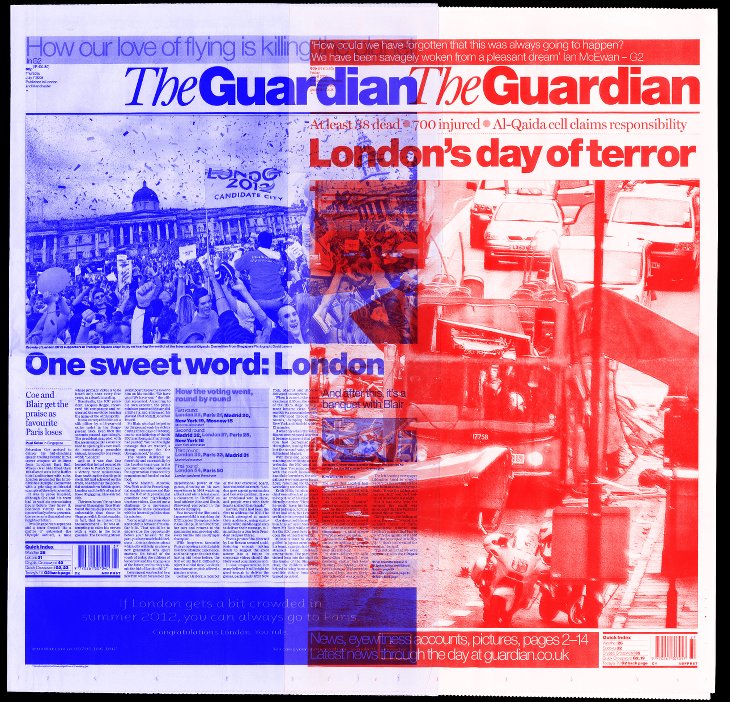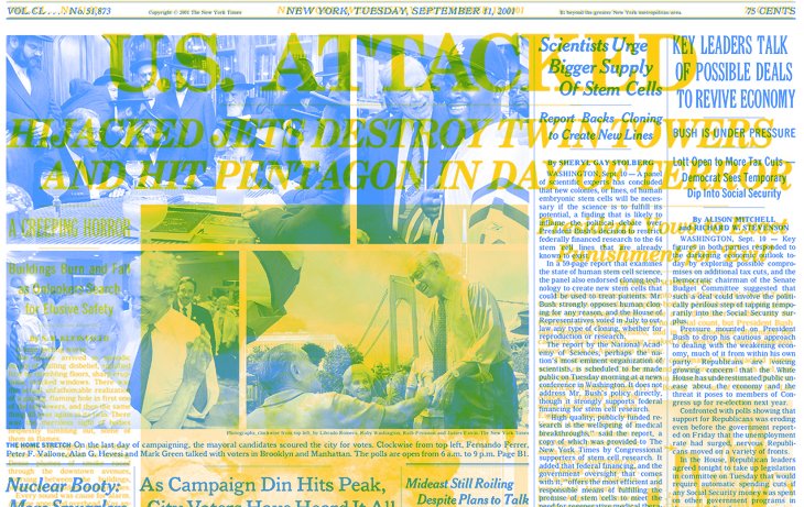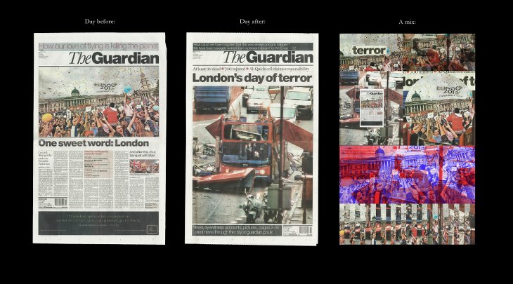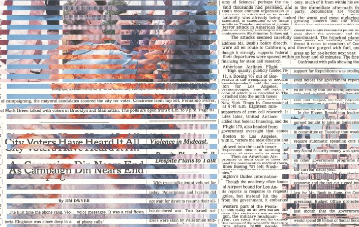 Utilisant à la fois des outils numériques et des techniques manuelles, nos artistes mélangent les styles éditoriaux, et les canards du monde entier, du Guardian au Japan Times. Les créations reposent aussi sur le procédé CMJN, souvent utilisé pour l’impression des journaux, qui consiste à passer les pages dans une seule tonalité de couleur et à les superposer : « Nous révélons ainsi à quel point un même cycle d’actualités peut être différent. Les choses peuvent changer radicalement du jour au lendemain », observe Polkinghorne, « Les autres nouvelles – qui pourraient normalement être considérées comme importantes – sont aussitôt reléguées aux pages suivantes. »