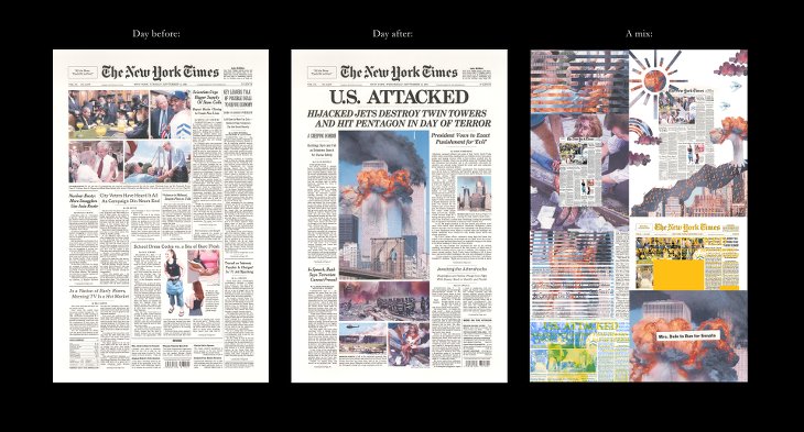 The News before the Storm, leur nouveau projet, détourne les codes graphiques typiques employés par les journaux pour les grands événements, en les mixant avec les couvertures des quotidiens de la veille. « Nous voulions souligner combien le moment présent était fragile en présentant des événements qui nous touchaient tous », nous a précisé par mail Ben Polkinghorne. Lorsqu’un drame se produit, la presse utilise immanquablement une imagerie grand format, émotive : « L’horreur jaillit presque de la page », remarque-t-il. « Instinctivement, nous avons senti que le collage fonctionnerait bien. Il crée des juxtapositions visuelles intéressantes, comme les superpositions. »
